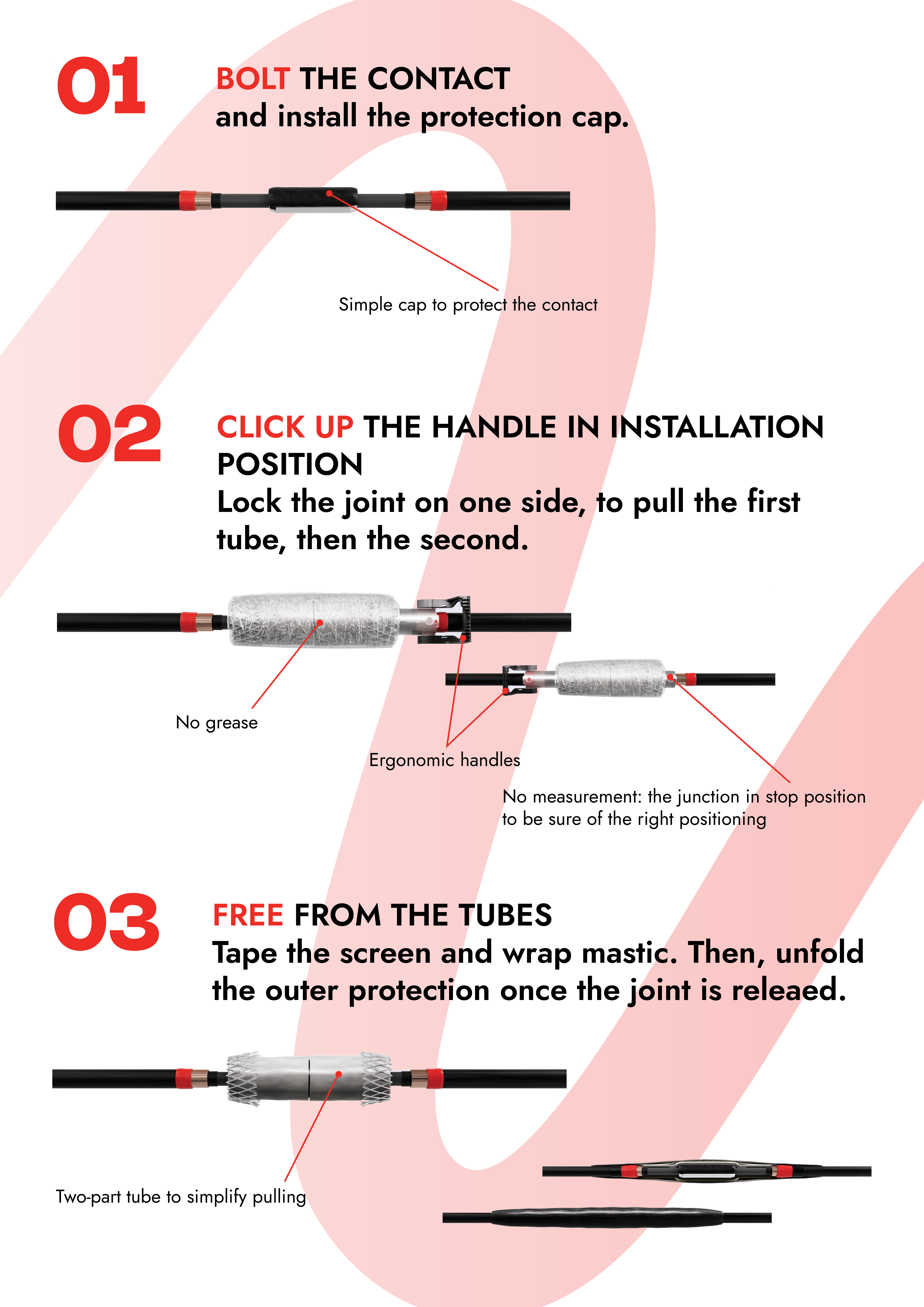 The cold shrink EASY TECH single core straight JOINT family is designed for the connection of cables with nominal voltage 36 kV (Um), with a copper wire screen or extruded conductive screen, upon version.